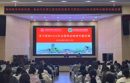为深入学习贯彻2026年全国两会精神,3月31日下午,食生学院党委与教师教育学院党委在自强楼学术报告厅109会议室联合举办全国两会精神专题党课。本次党课由学校党委理论宣讲团成员聂文凯老师主讲,两学院全体师生党员参加。